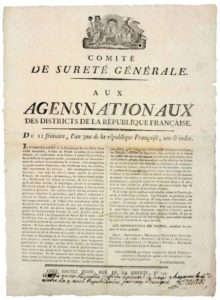 AN 3. PYRÉNÉES-ATLANTIQUES – Adresse du « COMITÉ DE SÛRETÉ GÉNÉRALE, aux Agents Nationaux des Districts de la République. » du 12 Frimaire An 3 (2 Déc. 1794). Vignette « République Française, Droits de l’Homme. ». Collationné par l’Agent Nationale du District d’USTARITZ. Placardé à BAYONNE (Souscription manuscrite signé CRUAX) « l’Établissement de la République sur les débris d’une vieille Monarchie, le Salut du Peuple au milieu de nombreux ennemis, la conservation de la France à travers les trahisons, les perfidies & les guerres civiles, commandèrent au Gouvernement des mesures extraordinaires et violentes… Il est temps que les passions individuelles cèdent à l’intérêt général, à l’instruction publique. Les français ne perdront point en vaines querelles l’avantage de cinq années d’économie, de patience, de courage : ils cultivent l’arbre de la liberté sans calculer encore ce que coûtera son fruit. Mais que l’aristocratie & la malveillance soient fermement rappeler à l’ordre ; que le peuple ne soit plus fatigué de leurs plaintes injustes, & que la révolution, qui ne fut qu’une mer orageuse, nous amène bientôt au port de l’égalité & au règne des lois. » Signés (impr.) des Conventionnels : Reverchon, Méaulle, Monmayou, Lesage-Senault, Mathieu, Garnier (de l’Aube), Armand, Clauzel, Laignelot, Barras, Reubell, Bourdon (de l’Oise), Levasseur (De la Meurthe). Impr. chez FAUVET Jeune, rue de la Liberté, N°153. Placard (42 x 31) État A