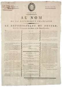 AN 3. IZOARD Le représentant du Peuple, dans les Départements des HAUTES ET DES BASSES-PYRÉNÉES. – Fait à PAU (64), le 6 Floréal An 3 (25 avril 1795) – « Vu l’état de la situation de la rentrée des contributions publiques dans le Département des Basses-Pyrénées, duquel il résulte qu’il est dû, en contribution arriérées, 1.647.618 livres ; que le directoire du District d’ORTHEZ n’a pas envoyé ses bordereaux de recouvrement…, et celui du District de MAULÉON… arrête… ». Vignette République Françaises. Impr. à TARBES, de l’Imprimerie des SANS-CULOTTES, rue de la Loi, N°131 – (Jean François Auguste IZOARD (1765-1840) est Conventionnel des HAUTES-ALPES.) Placard (57 x 41) État A