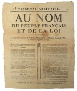 AN 3. ALPES MARITIMES. Au nom du peuple Français.. Arrêté du TRIBUNAL MILITAIRE DE L’ARMÉE D’ITALIE séante au Q.G. à NICE (06) le 17 prairial an 3 (5 Juin 1795), concernant la désertion. Impr. à AVIGNON, chez Mouriès, rue Galante. Vignette au coq. Placard (44 x 36) État A.