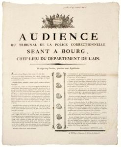 AN 4. AIN. « AUDIENCE du TRIBUNAL DE LA POLICE CORRECTIONNELLE séant à BOURG, chef-Lieu du département de l’Ain. » . du 25 Pluviôse an 4 (14 Février 1796) – « Prononce qu’Alexandre GUILLON Cultivateur demeurant à THOL, est condamné à subir 4 jours d’emprisonnement ». Étant de Garde, il s’est répandu en injures et mauvais propos contre l’officier du Poste ; que par suite de cet excès, il avait déchiré et jeté au feu un imprimé du Département affiché au Corps de Garde. BOTTEX Agent Municipal de la Commune de NEUVILLE-SUR-AIN fut injurié et maltraité dans l’exercice de ses fonctions. Vignette « Egalité, Liberté » & frise de bonnets phrygiens -Impr. à BOURG, de l’Imprimerie de DUFOUR et JOSSERAND. Placard (47 x 38) État A