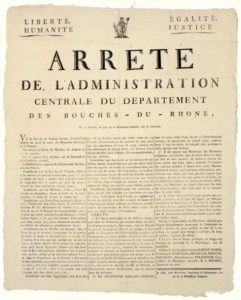 AN 4. BOUCHES-DU-RHÔNE. 1796. BIENS NATIONAUX . Arrêté de l’Administration Centrale du Département des Bouches-du-Rhône, du 25 Prairial an 4 (13 Juin 1796) – suite à l’instruction relative au mode de vente des Domaines Nationaux. Devise : Liberté, Humanité, Égalité, Justice. ». Impr. à AIX, chez MOURET, Imprimeur du Département. Placard (54 x 43) État A