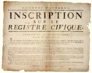 YONNE. 1797. COMMUNE D’AUXERRE. « INSCRIPTION SUR LE REGISTRE CIVIQUE. ». Fait le 17 Nivôse An 5 (6 Janvier 1797) – « Extrait de la Constitution : Tout homme né et résident en France, qui, âgé de 21 ans accomplis, s’est fait inscrire sur le Registre civique de son Canton, qui a demeuré depuis pendant une année sur le territoire de la république, et qui paie une contribution directe, foncière et personnelle, est CITOYEN FRANÇAIS. », & Avertissement de l’ouverture d’un registre à l’administration municipale. LAPORTE Président, TENAILLE, POUSSARD, PETIT-SALOMON, RAMPONNEAU, DUDESERT, VAULTIER, Administrateurs, DEFRANCE Commissaire du Directoire exécutif.. - Impr. à AUXERRE, de l’imprimerie de BAILLIF, an 5. Placard (41 x 52) État B