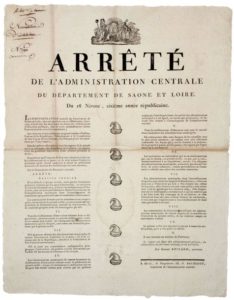 SAÔNE-ET-LOIRE. 1798. L’ÉDUCATION PUBLIQUE TENUS PAR DES PRÊTRES RÉFRACTAIRES. « Arrêté de l’administration Centrale du Département de Saône-et-Loire ; Séance du 16 Nivôse An 6 » (5 Janvier 1798) « Instruite que dans son arrondissement, beaucoup d’individus ont formé des établissements d’éducation publique…Que dans ces Ecoles l’amour de la République, l’attachement à la Constitution de l’An 3 et au Gouvernement, n’y font pas partie des sentiments que l’on y inspire ; Que les Prêtres Réfractaires y sont l’organe de la morale qui y sont enseignés, les formateurs de l’opinion, les régulateurs des premières impressions d’une jeunesse précieuse et docile… » Arrête « qu’il est défendu à qui que ce soit, autres que les instituteurs primaires nommés par le Jury d’instruction, en exécution de la Loi du 3 Brumaire An 4, d’ouvrir des établissements d’éducation, sans avoir préalablement obtenu l’autorisation de l’administration municipale… » Vignette et bonnets phrygiens – Impr. à MACON, de l’Imprimerie d’E.–P. Baudinot, Imprimeur de l’Administration Centrale. Placard (53 x 41) État B.