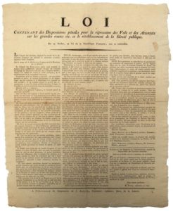 AN 6. (PYRÉNÉES ORIENTALES) « LOI contenant des dispositions pénales pour la répression des Vols et des Attentats sur les grandes routes etc. et le rétablissement de la Sûreté publique. » – du 19 nivôse An VI (8 Janvier 1798) . Impr. à PERPIGNAN (66), de l’Imprimerie de J. Alzine, Imprimeur-Libraire, Place de la Liberté. Placard (53 x 43) État B+