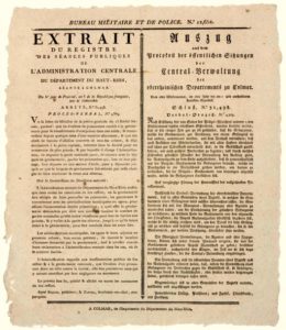 AN 6. (HAUT-RHIN). ÉVASION DES PRISONNIERS. “Extrait du registre des Séances publiques de l’Administration centrale du Département du HAUT-RHIN, séante à COLMAR (68) du 6 Prairial An 6 (25 Mai 1798). Bureau Militaire et de police N°12652 – au sujet d’évasions de prisonniers confiés à la Gendarmerie lors des transfèrement d’une prison dans une autre. « Des Chefs de bande d’assassins couverts de tous les crimes, & déjà condamnés à la peine capitale, rentrent dans la société pour en commettre de plus grands, & par laquelle il charge l’administration, de requérir à la Garde Nationale pour, de ce concert avec la Brigade de Gendarmerie, garder les prisonniers qui, lors de leur passage, sont déposés dans une maison d’arrêt, pour y séjourner jusqu'à ce que la brigade de gendarmerie soit relevée par celle chargée de faire continuer la route aux détenus ». Impr. à COLMAR, de l’Imprimerie du Département du HAUT-RHIN. Placard Bilingue (42 x 36) État A.