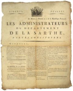 SARTHE. 1799. LEVÉE POUR L’ARMÉE “Les Administrateurs du Département de LA SARTHE, à leurs Concitoyens.”. LE MANS 5 Floréal An 7 (24 avril 1799). “Depuis quelques jours les malveillants se plaisent à répandre des bruits alarmants, & à persuader aux hommes faibles, que la faveur de l’exemption de la Levée de deux cents mille hommes accordée à ce Département est reportée...” Que les citoyens lisent la Lettre suivante du Ministre de la Guerre MILET-MUREAU.. – Vignette « République Française ». Impr. au MANS chez MERRUAU. Placard (53 x 42) État B