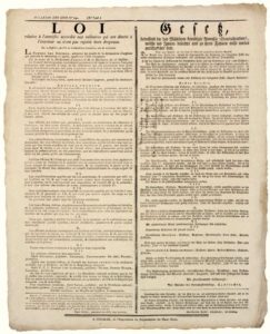 HAUT-RHIN. 1799. “LOI relative à l’AMNISTIE accordée aux Militaires qui ont déserté à l’Intérieur ou n’ont pas rejoint leurs drapeaux.” Du 14 messidor An 7 (2 Juillet 1799)- signé GENISSIEU Président; AUGEREAU, GRANDMAISON Fils Ainé, POURET Secrétaires. Impr. à COLMAR, de l’imprimerie du Département du Haut-Rhin. Placard bilingue (53 x 43) État A.