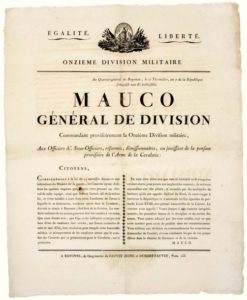 PYRÉNÉES ATLANTIQUES. 1799. Quartier général à BAYONNE (64) 15 Thermidor an 7 (2 Août 1799). Adresse de MAUCO Général de Division commandant provisoirement la 11° Division Militaire. aux Officiers & Sous-Officiers, réformés, démissionnaires, ou jouissant de la pension provisoire de l’Arme de la Cavalerie. Adresse patriotique “Les Ennemis.. relèvent aujourd’hui une tête altière... ils osent songer à renverser la République et à substituer les Lys ignobles du prétendu LOUIS XVIII, aux palmes immortelles de la Liberté. La Victoire vous appelle! Venez donner à une jeunesse inexpérimentée, les premières leçons de la discipline et du métier des armes...”. Belle vignette. Impr. à BAYONNE, de l’imprimerie de FAUVET Jeune et DUHART-FAUVET, Num. 153. Placard (52 x 43) État A