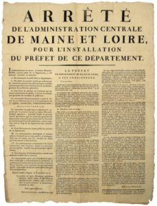 MAINE-ET-LOIRE. 1800. Arrêté de l’Administration Centrale de Maine et Loire pour l’installation du Préfet de ce département. – Et Adresse du Préfet MONTAULT-DESILLES, à ses concitoyens. Fait et arrêté à ANGERS le 8 Germinal, an 8 (29 Mars 1800) – Imprimé à Angers, chez Mame, Cour de l’Oratoire, rue de la Loi. Placard (60 x 46) Etat A