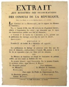 AN 10. VAR. MARIAGE. « Extrait des Registres des Consuls du 10 Floréal an 10 (30 Avril 1802), relatif à L’ORGANISATION DES CULTES ». “..Les publications de Mariage ne pourront avoir lieu que les jours de Dimanche..”. BONAPARTE premier Consul & CHAPTAL. Impr. à DRAGUIGNAN , chez Fabre, Imprimeur Libraire, place République. Placard (47 x 36) État B