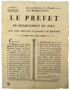 JURA. 1802. « Le Préfet du Département du JURA, aux Sous-préfets et Maires du ressort. » …