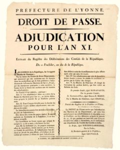 YONNE. 1802. “DROIT DE PASSE. Adjudication pour l’an XI” (Titre). Extrait du Registre des délibérations des Consuls de la République du 10 fructidor an 10 (28 Août 1802). arrêtent : « Les adjudications faites ou à faire de la Ferme des Barrières pour l’an 11 ne seront définitives qu’après la journée du 30 fructidor.. tout citoyen solvable aura la faculté de renchérir... la surenchère ne pourra être moindre d’un dixième du prix de l’adjudication. » signé (impr.) BONAPARTE Premier Consul. & Arrêté de ROUGIER-LABERGERIE Préfet de l’Yonne – Impr. à AUXERRE, de l’Imprimerie de Laurent FOURNIER, An X. Placard (50 x 40) Etat A
