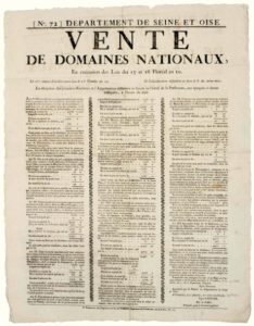 SEINE ET OISE. 1803. « VENTE DE DOMAINES NATIONAUX en exécution des Lois des 15 et 16 Floréal An 10. » – VERSAILLES(78) 1er Pluviôse an 11 (21 Janvier 1803) – l’Adjudication définitive se fera le 6 « 1) Maison, Batimets, cours, parcs, clos,.. provenant de l’ÉMIGRÉE Rosalie LEVASSEUR, situé Commune de CHENEVIERES, 2° Pièce de Pré Commune de PONTOISE, provenant de BOURBON-CONTY. 3° BOIS provenant des ci-devant Célestins de MARCOUSSIS ; 4) Terres labourabes provenant de Jacques françois HUDEBER-BLANEBUISSON, prévenu d’Émigration, situés à DAMMARTIN ; 5°) Terres provenant de la présuccession de Veuve OLIVIER ; 6) Maison, dite l’Hôtel Toulouse, provenant de Madame Veuve d’ORLÉANS ; 7) Maison à VILLECRESNES ; 8) Terres à FROMONT, RIS, PLESSIS, GRIGNY ; 9) Terres à MENIL-RENARD & BONNIÈRES ; 10) Terrain hors la Porte de l’Orangerie, à VERSAILLES ; 11) La Ferme de MONTAUGLAND, provenant de la Liste-Civile ; 12) Le Moulin à eau, dit le Gaillonnet, provenant de Pierre Marc GASTON-DE-LÉVY. » (N°72). Impr. à Versailles, chez PIERRES, Imprimeur de la Préfecture, Rue de la Paix, N°23. Placard (59 x 45) État A