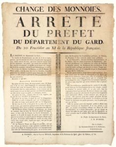 GARD. 1803. « CHANGE DES MONNAIES ». Arrêté de J. B. DUBOIS Préfet du Département du GARD, du 20 Fructidor An 11 (7 sept 1803) sur le Change des Monnaies – « Vu l’Arrêté du Gouvernement, en date du 6 de ce mois, portant : que les écus de 3 Livres et les pièces de 24 Sous, 12 sous et 6 sous, qui n’ont conservé aucune trace de leur empreinte, ont perdu, aux termes des anciennes lois, leur caractère de monnaie, et qu’elles seront reçues aux changes des hôtels des monnaies, suivant le Tarif déterminé par cet arrêté… ». Impr. à NÎMES, chez la Veuve BELLE, Imprimeur de la Préfecture du Gard, Place du Château, N°32. Placard (54 x 41) État B.