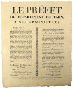 TARN. 1803. MONNAIE. Arrêté du Préfet du Tarn LATOURRETTE, qui admet dans les payements, et sans poids, les écus de six livres tournois qui ne sont point rognés et qui laisse dans la circulation les écus de trois livres et les pièces de 24, 12 et 6 sous, qui ont conservé la plus légère trace de leur empreinte. ALBI (81) 13 Brumaire an 12 (5 Nov. 1803). Impr. à ALBI, de l’Imprimerie du Citoyen COLLASSON, rue Saint-Salvi. Placard (46 x 38) État A.