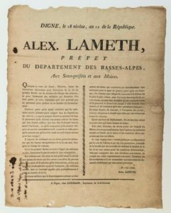 DIGNE (04) 18 Nivôse An 12 (9 Janvier 1804). Adresse d’Alexandre LAMETH Préfet des Basses-alpes, aux sous-préfets et Maires, au sujet de la Création des CAMPS DE VÉTÉRANS et pour l’admission des militaires qui désiraient d’en faire partie. « Je vois, qu’il s’est présenté peu de personnes pour profiter de ce bienfait du Gouvernement… Les Vétérans une fois reçus ne sont point tenus à cultiver eux-mêmes les terres qui leur seront concédées… Je vous engage donc à rendre publiques ces dispositions par la voie de l’affiche ou par des avis particuliers… » Placard (42 x 32) État B+.