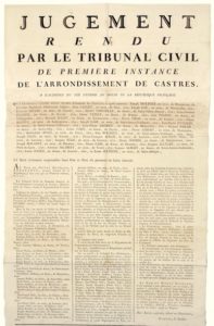 AN 12. CASTRES (TARN). “JUGEMENT rendu par le Tribunal Civil de 1ère Instance de l’Arrondissement de CASTRES, à l’audience du 10 Ventôse An 12 (1 Mars 1804). ”. “Au Nom de BONAPARTE Premier Consul...” – (Condamnations de Conscrits du 10 Régiment d’Infanterie Légère, venant du Tarn et de l’Aveyron) – Impr. à CASTRES, chez J. AUGER, Imprimeur, rue du Temple, section 2, N°288. Placard (71 x 42) État A.