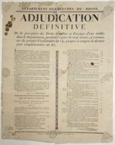 TARIF DES DROITS DES BACS ET PASSAGES D’EAU DANS LES BOUCHES-DU-RHONE. « Adjudication définitive de la perception des Droits de Bacs et Passages d’eau établis dans le Département des Bouches-du-Rhône, pendant l’espace de neuf années, à commencer du 1er Vendémiaire An 13, jusques et compris le dernier jour complémentaire an 21. TARIF des droits à percevoir, exigibles sur les Bacs et Bateaux de passage : passage d’ARLES sur le Rhône à NOVES, de CHÂTEAU-RENARD, d’ORGON et de SENAS sur la Durance. Lettre du Préfet A.C. THIBAUDEAU, Marseille le 1er Thermidor An 12 (20 Juillet 1804). Traces d’affichage. Placard (57 x 45). Etat B