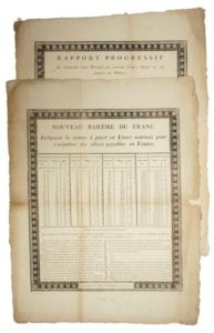 MONNAIE. CONVERSION DU NOUVEAU FRANC, 1804 : 2 PLACARDS (42 x 33) de l’Imprimerie de FARGE, rue des Mathurins, N° 393, à PARIS : 1°) « NOUVEAU BARÈME DU FRANC indiquant la somme à payer en Livres tournois pour s’acquitter des objets payables en francs. Extrait de la Loi du 17 Floréal An 7, qui change la manière de compter les pièces de monnaie d’or et d’argent, dans les caisses publiques et dans le commerce, à dater du premier vendémiaire An 8 (23 Sept 1804) + 2°) « RAPPORT PROGRESSIF DE L’ANCIENNE LIVRE TOURNOIS AU NOUVEAU FRANC, depuis un Sol, jusqu’à un Million, calculé en fractions décimales du Franc, sur la bas de Ofr. 987654328/81, pour une Livre Tournois » - Les deux Etat B