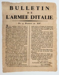 EMPIRE. CAMPAGNE D’ITALIE 1805. « BULLETIN DE L’ARMÉE D’ITALIE. » du 14 Brumaire An XIV (5 Nov. 1805). « Après quelques heures de repos à MONTEBELLO, l’armée poursuivit l’ennemi à VICENCE… Les Autrichiens s’étaient retirés par le chemin de BASSANO ; L’Armée les y suivit, et entama continuellement leur arrière-garde…. Nous marchâmes vers la BRENTA. L’avant-garde arriva au moment où l’ennemi tentait de détruire le pont. Il s’engagea d’une rive à l’autre une forte canonnade, que la nuit seule fit cesser… Je fis passer à gué plusieurs régiments de cavalerie avec les voltigeurs en croupe, pendant qu’on réparait le pont. L’armée défila bientôt, et nous arrivâmes à CITTADELLA… A 5 heures du soir, nous entrions dans CASTELFRANCO… Dans notre marche depuis MONTEBELLO, nous avons fait plus de 1800 prisonniers. La division de droite s’est dirigée sur PADOUE,… celle de gauche s’est portée sur BASSANO, qu’elle occupera demain. L’Armée marche sur la PIAVE. » Pour copie, le Conseiller d’Etat, Préfet de Police, DUBOIS. De l’Imprimerie de J.-R. LOTTIN, Imprimeur de la Préfecture de Police, Cour Sainte-Chapelle, N°28, Division du Pont-Neuf, An 14. Placard (52 x 41) État A