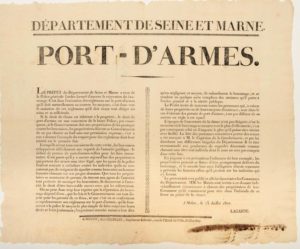SEINE-ET-MARNE. « PORT-D’ARMES. » MELUN (77) 23 Juillet 1807. Avis de LAGARDE Préfet de Seine-et-Marne. Il a reçu de la Police générale l’ordre formel d’assurer la répression du BRACONNAGE. « C’est dans l’exécution des règlements sur le port-d’armes qu’il doit naturellement en trouver les moyens… » Impr. à MELUN, chez MICHELIN, Imprimeur-Libraire, rue de l’Hôtel-de-Ville, Juillet 1807. Placard (37 x 45) État B. sur papier timbré, au verso, annulé et recyclé.