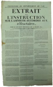 1810. VAR. « Extrait de l’instruction sur l’AMNISTIE accordée aux Réfractaires, par le décret Impérial du 25 Mars 1810. ». Arrêté de D’AZEMAR Préfet du Var le 20 Avril 1810. Impr. à DRAGUIGNAN, chez Guichard Cadet. Placard (72 x 43) Etat A
