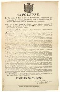 ITALIE. 1811. PRESSE & LIBRAIRIE. Décret à l’entête de NAPOLEON 1er Empereur des Français, Roi d’Italie, suivi de l’ordonnance d’EUGÈNE NAPOLÉON (Beauharnais) de France, Vice-Roi d’Italie, Prince de Venise – Palazzo Reale di MILANO 1er août 1811 – Décret sur la Taxe de 1 centimes par feuille de presse pour tous les ouvrages qui sortiront pour la Direction Générale de la Presse et de la Librairie – (impôts pour les libraires, Obligations des imprimeurs et des auteurs français). Texte en italien – Vignette à l’aigle. Impr. à MILAN (MILANO), de l’imprimerie Royale – Vignette à l’aigle. Placard (43 x 27) Etat A.
