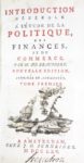 BEAUSOBRE (Louis de). Introduction générale à l'étude de la politique, des finances, et du commerce. Nouvelle édition, corrigée et augmentée. Amsterdam, Schneider, 1765. 2 tomes en un volume in-12, basane marbrée, dos orné, pièce de titre rouge, tranches marbrées (Reliure de l'époque).