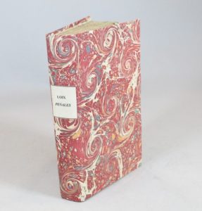 DUFRICHE DE VALAZÉ (Charles-Éléonore). Loix pénales, dédiées à Monsieur, frère du Roi. Alençon, De l'Imprimerie de Malassis le jeune, 1784. In-8, cartonnage de papier marbré, non rogné (Reliure moderne).