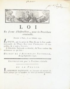 LOI en forme d'Instruction, pour la Procédure criminelle. Donnée à paris, le 21 Octobre 1791. S.l. [Toulon], De l'Imprimerie de Mallard, s.d. In-4, 76 pages, en feuilles cousues d'un fil.