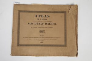 [ALGÉRIE]. Atlas de l'aperçu historique, statistique et topographique sur l'État d'Alger, a l'usage de l'armée expéditionnaire d'Afrique. Paris, Ch. Picquet, Géographe, 1830. In-4° oblong, broché.Six cartes ou plans repliés et neuf lithographies par ARDIT.Un titre-frontispice et six figures par GRAVELOT, gravées par BINET ; culs-de-lampe.« Belle édition » (Cohen, 664).