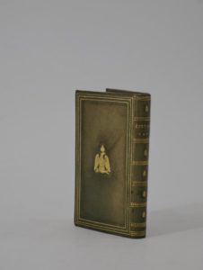 [ALMANACH]. Étrennes intéressantes des quatre parties du monde […] pour l’année 1809. A Paris, Chez Langlois, s. d. [1809]. In-24 (XXXX x XXXX mm), chagrin vert, filets et fine roulette dentelée dorés encadrant les plats, aigle impérial couronné au centre, dos lisse orné (Abbaye de Maumont).Cartes repliées.Dos et second plat insolés.