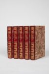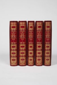 [BOCCACE]. Le Decameron de Jean Boccace. Londres [Paris], 1757-1761. 5?volumes in-8°, maroquin rouge, triple filet doré encadrant les plats, dos à nerfs orné, doublure de maroquin bleu orné d'une large dentelle d'encadrement, gardes de moire rose, tête dorée, étuis (Joly Fils).PREMIER TIRAGE.Un portrait en frontispice du tome I, cinq titres-frontispices et 110 figures hors texte par BOUCHER, COCHIN, EISEN & GRAVELOT, gravées par FLIPARD, LEMPEREUR, LE MIRE, MARTENASI, SORNIQUE, TARDIEU… ; bandeaux et culs-de-lampe.Exemplaire dont certaines planches portent le paraphe signalé par Cohen (160-161) pour signe de premier tirage.BEL EXEMPLAIRE, DANS UNE RELIURE EN MAROQUIN DOUBLÉ À DENTELLE, DE L’« UN DES LIVRES ILLUSTRES DES PLUS REUSSIS DE TOUT LE XVIIIE SIECLE » (Cohen, 158-161).