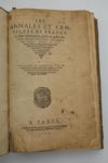 [GILLES (Nicole)]. • Les Annales et croniqves de France, ou sont contenus les faictz & gestes des Roys Treschrestiens, ensemble les choses avenves en levr Temps, iadis composées par feu Maistre Nicole Gilles, en son viuant Notaire & Secretaire du Roy Loys, douziesme, & Controlleur de son Thresor. •• Le Second volvme des annales […]. A Paris, Pour Pierre Thierry, Libraires, 1560. 2 tomes en un?volume petit in-folio, vélin vert, dos à nerfs (reliure de l'époque).• [VI] + CXXX ff. •• [V] + CLV ff.« Corrigees et annotees par le Seigneur Denis SAUUAGE, de Fontenailles, en Brie, & continuées & additionnées selon les Modernes Historiographes, iusques au Roy Francoys, deuxiesme du nom. »Lettrines, vignette et grands tableaux généalogiques.Exemplaire réglé.Petits accidents et salissures sur la page de titre et le dernier feuillet ; pages rousses.Brunet, XXXX Pas trouvé cette édition.