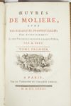 [MOLIÈRE]. Œuvres […], avec des remarques grammaticales?; des avertissemens et des observations sur chaque pièce, par M. BRET. A Paris, Par la Compagnie des Libraires Associés, 1773. 6?volumes in-8°, veau, triple filet doré encadrant les plats, dos à nerfs orné (reliure de l'époque).Un portrait gravé par CATHELIN, d’après MIGNARD, et 33 figures gravées à l’eau-forte par BAQUOY, DE LAUNAY, DUCLOS, LEBAS, NÉE & SIMONET, d’après des dessins de MOREAU LE JEUNE.Pp. 66-67 & 80-81 du tome I en double, comme dans tous les «?bons exemplaires?».Quelques accidents au dos des reliures.BELLE ÉDITION. « La suite des figures de Moreau est une des plus estimées?» (Cohen, 717).
