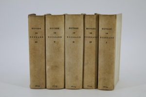 [RONSARD]. Les Oevvres de P. de Ronsard gentil-homme vandomois, Prince des Poëtes François. A Paris, Chez Mathurin Henault, 1629, Chez Nicolas Buon (t. I, II, III, IV & V), et Chez Barthelemy Macé (t. VI & VII), 1619. 11 parties en 5?volumes XXXX in-16, vélin ivoire (Paul Vié relieur).Quinzième édition collective, « reueuë & augmentee ».Vignette répétée sur les titres, la première ornée du portrait de l'auteur.Tome I : Les Oeuvres.Tome II : Les Odes (tomé « deuxiesme »).Tome III : • Les Quatre premiers livres de la Franciade (tomé « III ») & •• Les Poemes (tomé « IV »).Tome IV : Les Hynnes [sic] (tomé « septiesme »).Tome V : • Discours des miseres de ce temps (tomé « neufiesme »), •• Les Epitaphes de divers suiet (tomé « X », sans page de titre) & ••• Recueil des sonnets, odes, hymnes, elegies, et autres pieces retranchees aux editions precedentes […].Les pp. 273 à 280 du Recueil des sonnets […] sont en déficit et remplacées par des feuillets blancs.Tchemerzine, IX, 486 (qui donne les dates de 1629 et 1630, mais ne cite pas Macé en 1619). XXXX Recollationner parties et volumes.