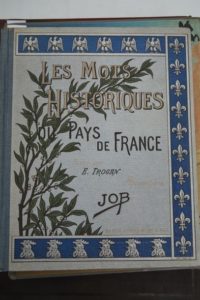 [ALBUM HISTORIQUE - JOB]. TROGAN (Édouard). Les Mots historiques du Pays de France. Tours, Alfred Mame & Fils, s. d. [circa 1922]. In-4°, percaline grise de l'éditeur, titre et décor polychrome ornant le premier plat (Paul Souze sc.).« Sixième édition, mise à jour. »Illustrations par JOB, dont dix-neuf en couleurs à pleine page.