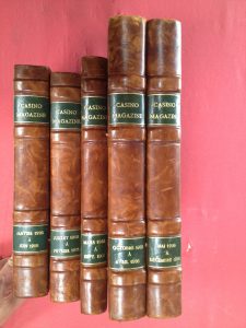 des 162 premiers numéros sous 5 volumes reliures demi basane havane flammée à coins, dos à nerfs. Pièce de titre de cuir vert. Tranches mouchetées. Couvertures conservées à partir du N° 84. Environ 12 à 16 pages par magazine. Iconographie en noir. Les 13 années complètes en 162 premiers numéros de « Casino magazine ». Revue strictement interne aux employés et gérant de la société Casino. Document rare et intéressant.