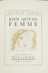 CARCO (Francis). Rien qu’une femme. Paris, 1925. In-4°, demi-chagrin rouge, dos à nerfs, couverture conservée (Abbaye de Maumont).Eaux-fortes en couleurs par CHAS-LABORDE.Tiré à 276 exemplaires, celui-ci (n° 199), un des 200 sur vélin de Rives.CARCO voir aussi JOU.