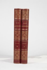 [DORÉ]. CERVANTÈS (Miguel de). L’Ingénieux Hidalgo Don Quichotte de la Manche. Paris, Librairie de L. Hachette et Cie, 1869. 2?volumes in-folio, demi-chagrin rouge, plats de percaline rouge, dos à nerfs orné (reliure de l'éditeur).370 compositions par Gustave DORÉ.Coins accidentés ; rousseurs.Leblanc, 68.