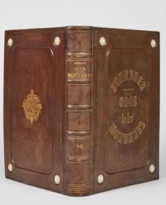 [DORÉ / ESPAGNE]. ZORRILLA (José). Ecos de las montañas. Leyendas històricas. Barcelona, Montaner y Simon, Editores, 1868. 2 tomes en un volume in-folio, chagrin brun, larges filets dorés en relief encadrant les plats, titre doré au centre du premier, cabochon d'ivoire aux angles, dos à nerfs orné, tranches dorées (reliure espagnole de l'époque).ÉDITION ORIGINALE & PREMIER TIRAGE.Illustrations par Gustave DORÉ.Mouillures sur les premières pages ; rousseurs, maisBEL EXEMPLAIRE DANS UNE RICHE RELIURE DE L' ÉPOQUE.Leblanc, 373 (qui ne cite qu'une édition de 1894 chez le même éditeur Montaner y Simon). XXXX