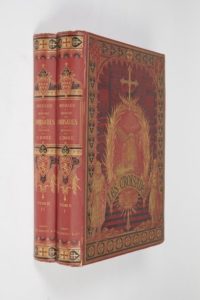 [DORÉ]. MICHAUD (Joseph). Histoire des croisades. Paris, Furne, Jouvet et Cie, Éditeurs 1877. 2 volumes in-folio, percaline rouge de l'éditeur, titre et large décor doré personnalisé ornant les premiers plats (A. Souze – Ch. Magnier rel.).100 compositions par Gustave DORÉ en premier tirage.Mors fendus sur dix cm.Leblanc, 240.