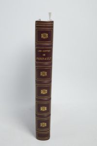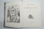 [DORÉ / PERRAULT]. Les Contes de Perrault. Paris, J. Hetzel, Libraire-Éditeur, 1869. Petit in-folio, demi-chagrin lie-de-vin à coins, dos à nerfs orné (Abbaye de Maumont).Un frontispice et 40 bois hors texte par Gustave DORÉ.« Le talent de paysagiste de Gustave Doré s’est encore accru et complété dans le Perrault » (Leblanc, 277).