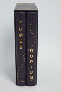 FARRÈRE (Claude). Fumée d’opium. Paris, Aux Éditions Lapina, 1929. 2 volumes in-4° (dont un pour les suites), maroquin violet (et chemise demi-maroquin), couverture illustrée conservée, étui commun (reliure fin XXe s.).37 eaux-fortes, dix-huit lettrines et dix-sept culs-de-lampe dessinés et gravés sur cuivre par Camille ROCHE.Tiré à 175 exemplaires, celui-ci (n° 47), UN DES 25 SUR JAPON IMPÉRIAL SIGNES PAR L’AUTEUR ET L’ARTISTE et contenant trois suites supplémentaires des eaux-fortes, certaines avec remarque. JOINT : le prospectus illustré.Dos assombri.