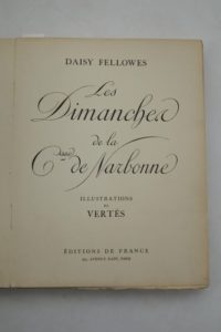FELLOWES (Marguerite DECAZES, dite Daisy). Les Dimanches de la Csse de Narbonne. Paris, Éditions de France, s. d. [1935]. Petit in-4° broché, couverture illustrée.Illustrations par Marcel VERTÈS.Tiré à 1 000 exemplaires, celui-ci (n° 858), un des 900 sur vélin blanc.