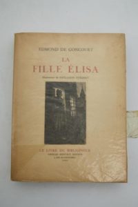 GONCOURT (Edmond de). La Fille Élisa. Préface par J.-H. ROSNY AINE. Paris, Le Livre du Bibliophile – Georges Briffaut, Éditeur, 1929. In-4° broché, étui.Vingt pointes-sèches par Paul-Louis GUILBERT, dont une en frontispice.Tiré à 425 exemplaires, celui-ci (n° 72), un des 30 sur vélin d’Arches contenant une suite supplémentaire des illustrations avec remarques.Quelques rousseurs.