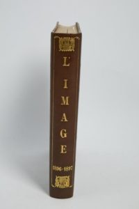 [IMAGE (L’)]. L’Image. Revue littéraire et artistique ornée de figures sur bois. Paris, Floury, Éditeur, décembre 1896 – décembre 1897. 12 livraisons réunies en un volume in-4°, demi-chagrin brun, dos lisse orné, couvertures illustrées conservées (Abbaye de Maumont).Nombreux bois dans le texte et 48 planches d’après DEGAS, GRASSET, HELLEU, LABOUREUR, MILLET, MUCHA, PISSARO, RODIN, SCHWABE, VIERGE…COLLECTION COMPLÈTE DES DOUZE NUMEROS DE CETTE REVUE CONSACRÉE A LA GRAVURE SUR BOIS, fondée par la Corporation française des graveurs sur bois « pour la conservation d’un art que les procédés mécaniques tendent à faire disparaître », et publiée sous la direction de Roger MARX et Jules RAIS.Couvertures des n° 2 à 5 & 7 à 11, seules conservées.« Ensemble rare et de qualité. La belle phalange de littérateurs et d’artistes donne une idée de la valeur de cette collection » (Carteret, Livres illustrés modernes, III, 196).