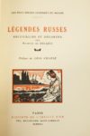[JAPON]. Légendes japonaises […] L'eau - La terre - Le ciel - Le feu. Recueillies et illustrées par T. FOUJITA. Préface par Claude FARRERE. •• [RUSSIE]. Légendes russes. Recueillies et décorées par Maurice de BECQUE. Préface par Léon FRAPIE. ••• [BRETAGNE]. Légendes bretonnes. Décorées par Maurice de BECQUE. Introduction par Adrien de CARNE. Paris, Éditions de l'Abeille d'Or, s. d. [1923], 1922 & 1921. Ensemble 3 ouvrages en un volume in-4°, demi-chagrin rouge, dos lisse orné d’un décor mosaïqué, tête dorée, couvertures conservées (reliure de l'époque).• Illustrations en couleurs par T. FOUJITA. Tiré à 2 104 exemplaires, celui-ci n° 817.•• Illustrations en couleurs par Maurice de BECQUE. EXEMPLAIRE SUR JAPON, celui-ci n° 12.••• Illustrations en couleurs par Maurice de BECQUE. EXEMPLAIRE SUR JAPON, celui-ci n° 236.