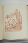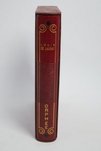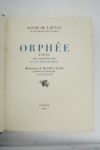 LAUNAY (Louis de). Orphée. Poème. Préface par SULLY-PRUDHOMME. Paris, 1942. In-folio, maroquin rouge, filet doré encadrant des plats entièrement ornés d'un décor géométrique de filets estampés à froid entrecroisés et courant sur le dos lisse, gardes de moire bleue, tête dorée, couverture conservée, étui (Yseux sr de Simier).Gouaches en couleurs par Maurice DENIS, gravées sur bois par Jacques BELTRAND.Tiré à 220 exemplaires sur vélin d'Arches, celui-ci n° XVI.