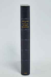 MAUROIS (André). Voyage au pays des Articoles. Paris, Jacques Schiffrin - Éditions de la Pléiade, s. d [1927]. In-8°, maroquin bleu janséniste, dos à nerfs orné, tranches dorées sur témoins, couverture illustrée conservée, étui (Canape et Corriez).Eaux-fortes et bois en couleurs par Alexandre ALEXEÏEFF.Tiré à 335 exemplaires, celui-ci (n° 31), un des vingt sur hollande Van Gelder contenant une suite supplémentaire des illustrations et une décomposition des couleurs sur japon mince.